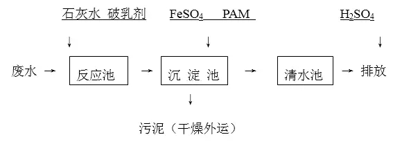2. 可采用三槽处理法:槽废水均化加石灰水及破乳剂中和沉淀,第二槽加硫酸铁、高分子絮凝剂等絮凝沉淀;澄清后进第三槽调节pH值后排放。其工艺流程为: